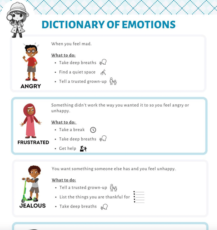 👉 Example: On Page 12, the "Dictionary of Emotions" activity encourages students to identify and express their emotions, helping teachers understand their students’ emotional states before the day begins.