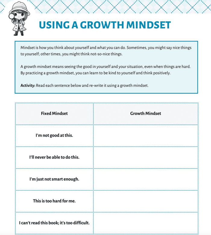 👉 Example: Page 34 features the "Using a Growth Mindset" activity, where students identify a time they struggled with a task and brainstorm ways to overcome similar challenges in the future.